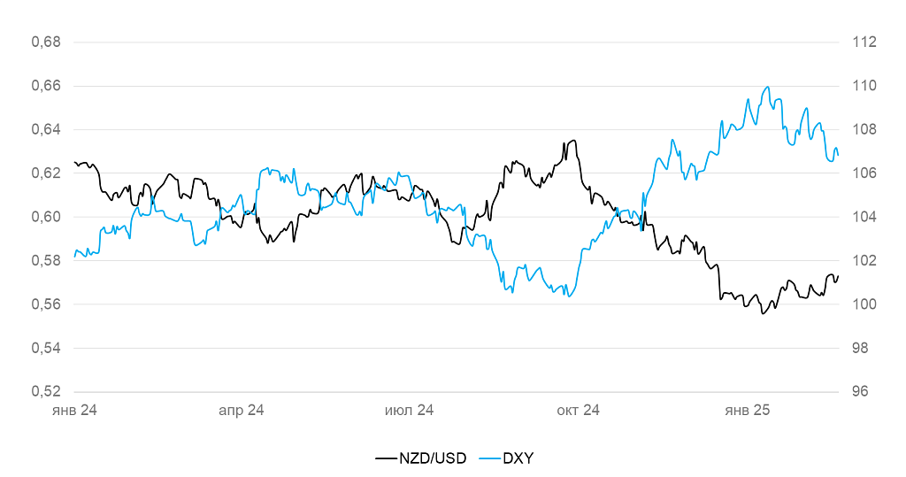 Динамика индекса доллара DXY и валютной пары NZD/USD