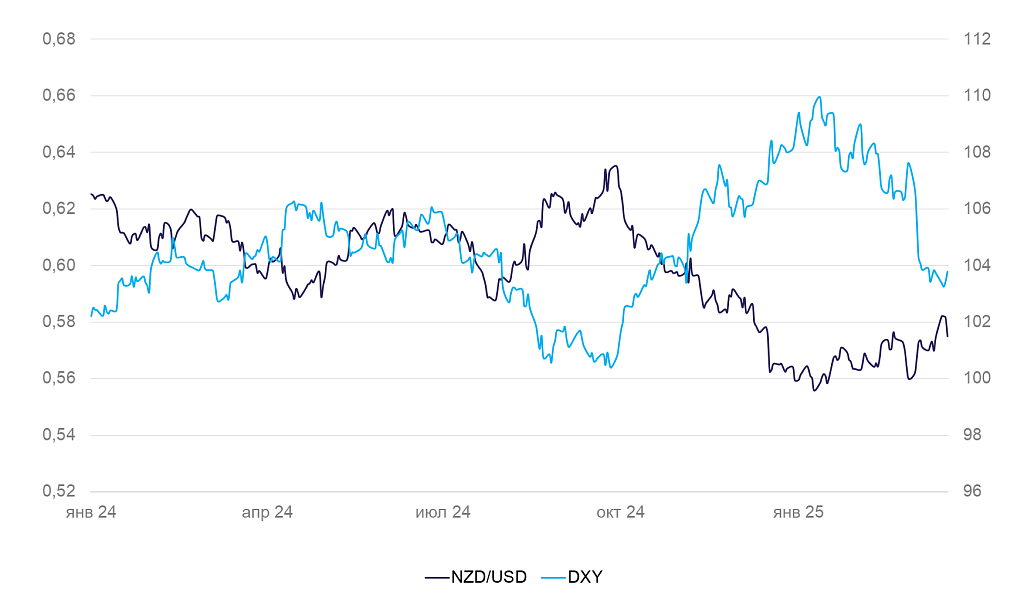 Динамика индекса доллара DXY и валютной пары NZD/USD