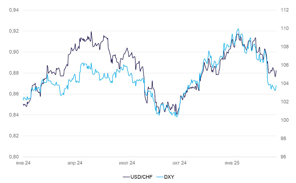 Динамика индекса доллара DXY и валютной пары USD/CHF
