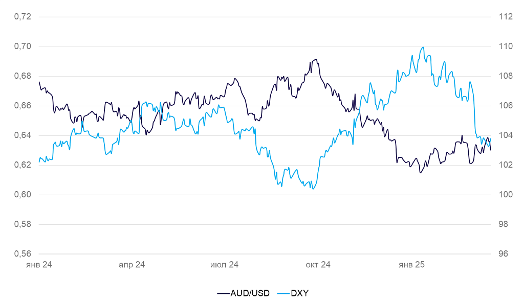 Динамика индекса доллара DXY и валютной пары AUD/USD