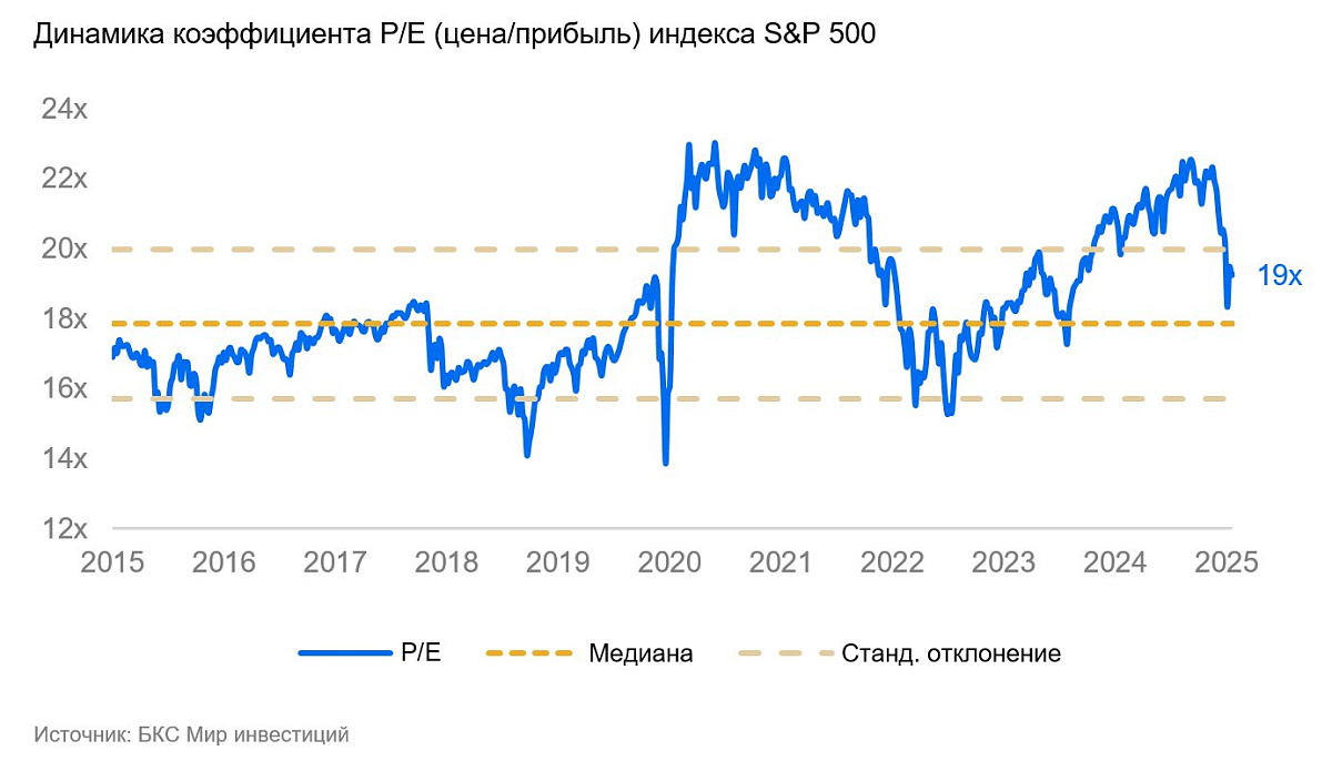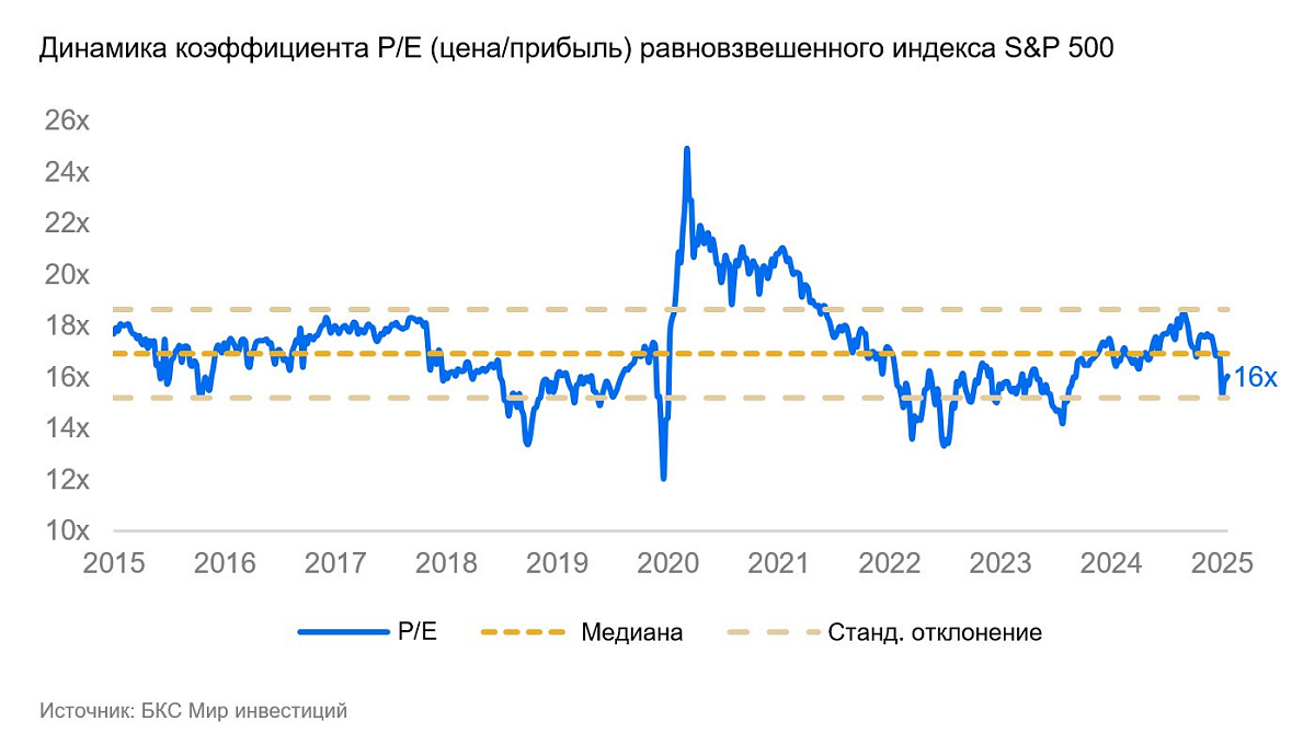 При этом равновзвешенный индекс S&P 500, в котором всем компаниям присвоен одинаковый вес, объективнее отражает оценку широкого рынка акций США. Долгое время оценки базового и равновзвешенного S&P 500 расходились. Однако после недавней коррекции мультипликаторы P/E обоих индексов пришли к исторически средним значениям. При этом рынок позитивно отреагировал на новость об отсрочке пошлин на 90 дней (кроме Китая), и считаем, что текущие уровни выглядят привлекательно. Также сейчас можно отобрать компании с перспективным потенциалом роста в быстрорастущих и стоимостных секторах экономики США.
