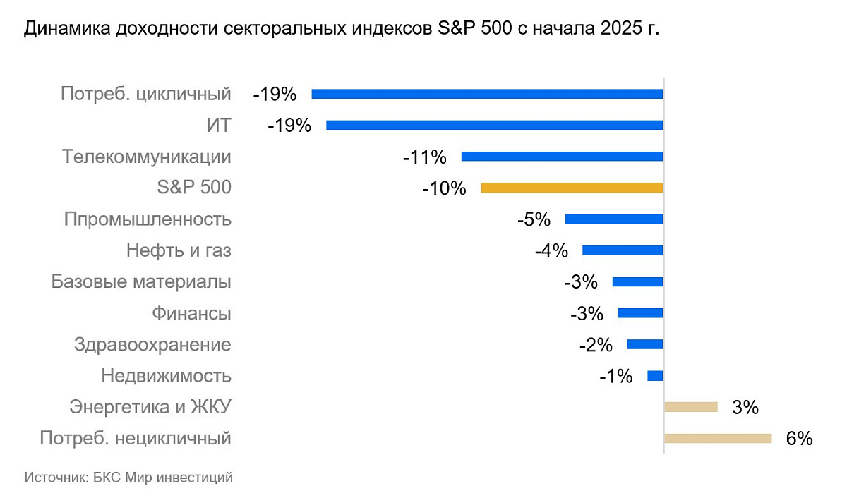 Оценка индекса S&P 500 упала после того, как США объявили пошлины. Основное снижение пришлось на ИТ, ретейл, недвижимость, нефтегазовый и финансовый сектора. Под давлением оказались в большей степени компании, которые занимаются международной торговлей, зависят от глобальных поставок и те, кто напрямую зависит от процентной ставки.