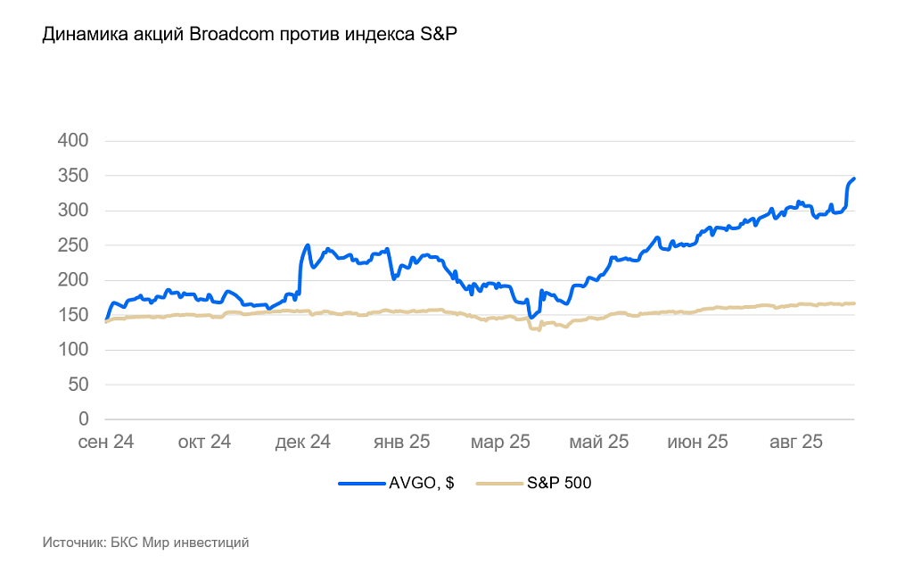 Акции Broadcom выросли более чем на 40% в 2025 г. и находятся на пиковых значениях.