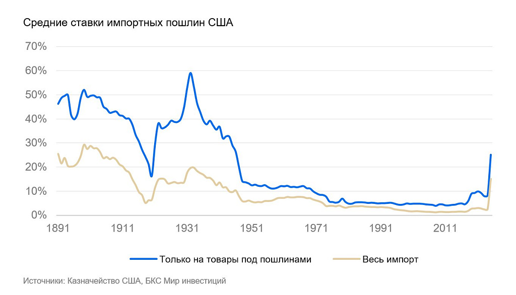 На текущий момент еще не закончены переговоры США с главным контрагентом — Китаем, и их успешность еще не гарантирована. Тем не менее средний эффективный уровень пошлин, на который может выйти экономика США, уже понятен — около 25% в номинальном выражении и 15% в среднем по экономике (с учетом того, что некоторые товары и компании пошлинами не облагаются). Большую часть своей истории США развивались со сравнимым уровнем пошлин. Полагаем, крупные компании смогут адаптировать к ним свои модели бизнеса и они не станут критическим препятствием для развития.