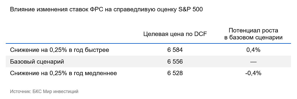 Также на рынок влияет политика ФРС. Даже ожидания снижения ставок могут поддерживать акции: исторически каждое снижение на 0,25% добавляло около 2,4% к индексу в течение двух месяцев (без учета кризисных периодов). В долгосрочной модели DCF влияние аналогичного снижения соответствует суммарному росту на 0,4%, к которому индекс возвращается через несколько месяцев после излишне эмоциональной реакции на снижение ставок.