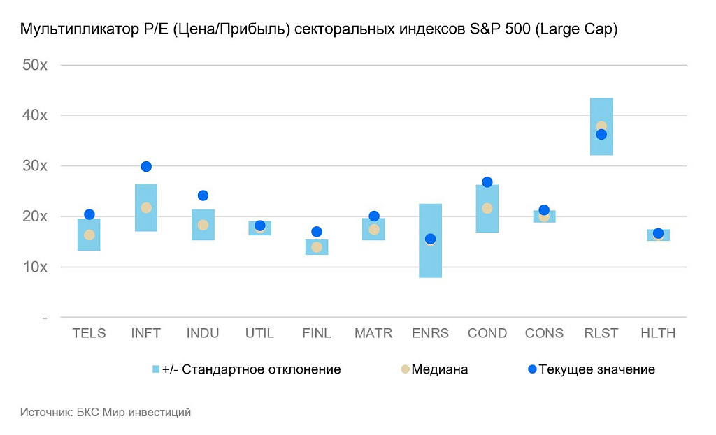 Большинство секторов торгуются с премией к историческим уровням, что обуславливает необходимость выборочного подхода. Приоритетными направлениями остаются потребительский нецикличный сектор, базовые материалы, промышленность, а также отдельные компании в секторе информационных технологий.