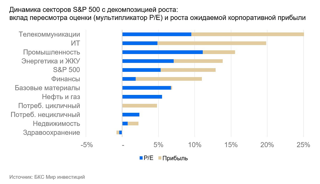 Эта тенденция особенно заметна в промышленности, где наблюдаются почти рекордные темпы роста. Дополнительную поддержку получили сектора жилищно-коммунальных услуг, базовых материалов и нефтегаза. При этом в большинстве отраслей рост связан с переоценкой мультипликаторов, тогда как в технологическом секторе ключевым фактором стало повышение ожиданий прибыли. Одновременно усилилось давление на сегменты, связанные с товарами не первой необходимости и эмоциональным потреблением, а также на компании, не выдерживающие конкуренции без господдержки.