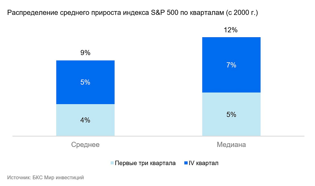Мы оцениваем текущую политику как благоприятную для долгосрочного развития экономики США. Фундаментально сильные компании и сектора способны обеспечить умеренно положительную — хотя и ограниченную — динамику широкого рынка. Поддержку может оказать и фактор сезонности: в среднем с 2000 г. IV квартал обеспечивал около 55% годового роста S&P 500, при этом в 83% случаев квартал был прибыльным. Это связано с сильной отчетностью за летний период, ростом потребления в преддверии зимних праздников, эффектом window dressing и перераспределением бюджетов в конце года.