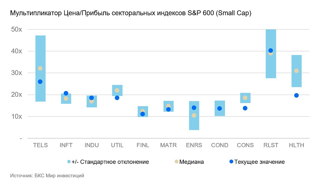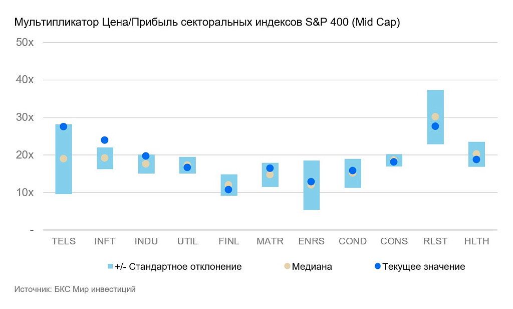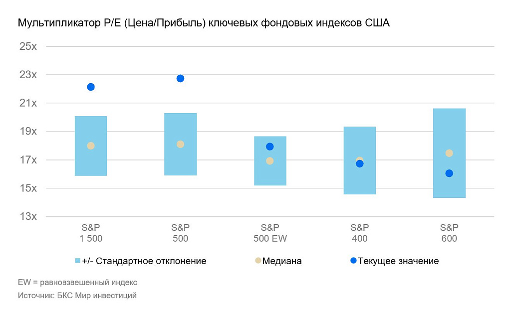 - Индексы S&P 400 и S&P 600 (средняя и малая капитализация) торгуются ниже медианных оценок и выглядят привлекательно