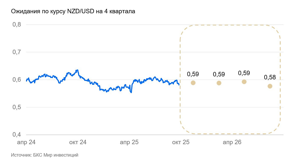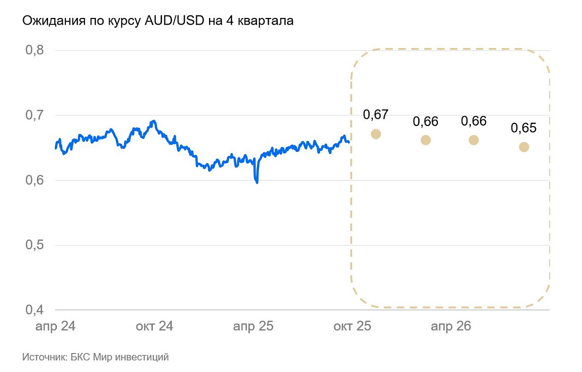 В перспективе одного–двух кварталов мы ожидаем дальнейшего укрепления австралийского доллара. Однако в конечном итоге «осси» продолжит тренд на ослабление, который длится более 15 лет. Экономика Австралии открыта, две трети экспорта направляются в азиатские страны. Основа экспорта — сырье: железная руда, металлы, нефть и газ, продовольствие. Пошлины США на азиатский импорт на фоне перепроизводства во многих сырьевых отраслях должны существенно снизить спрос на сырье. Из-за этого экономика Австралии может замедлиться, и ЦБ придется понижать ставку для поддержания экономической стабильности.