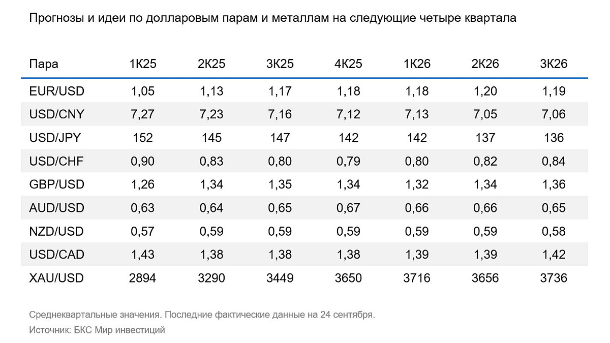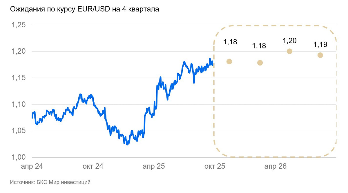 В III квартале курс доллара продолжил слабеть и достиг многолетних минимумов. Это результат оттока капитала из США для диверсификации рисков и ожиданий смягчения монетарной политики. Мы считаем, что ФРС будет смягчать ДКП до конца 2025 г. Однако влияние этого процесса на курс доллара будет куда менее выраженным, чем в первом полугодии 2025 г.: основное ослабление уже состоялось. В конце 2025 г. – I половине 2026 г. мы ждем стабилизации курса доллара к евро. Сужение спреда между ставками ФРС и ЕЦБ будет ослаблять доллар, однако экономика США фундаментально стабильнее экономики еврозоны, а геополитические и долговые риски для США существенно меньше.