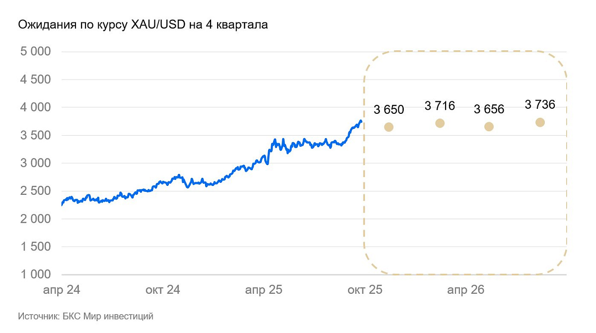 Вместе с тем, мы полагаем, что рынки закладывают слишком агрессивную траекторию снижения ставки ФРС и роста цены золота. Инфляция в США в IV квартале 2025 г. – I полугодии 2026 г. разгонится примерно до 3,5%. ФРС должна будет отреагировать и перестанет снижать ставку. Это приведет к росту номинальных процентных ставок, и краткосрочный спекулятивный спрос на золото остынет. Мы ожидаем, что спрос активизируется во II полугодии 2026 г., и золото вновь начнет дорожать.