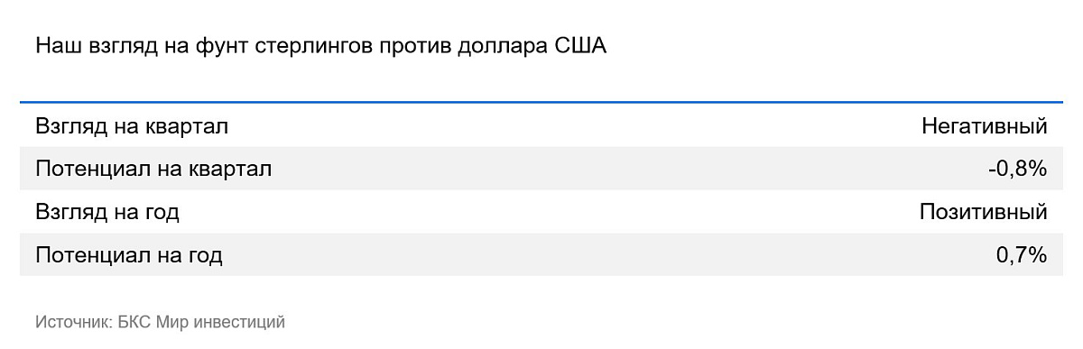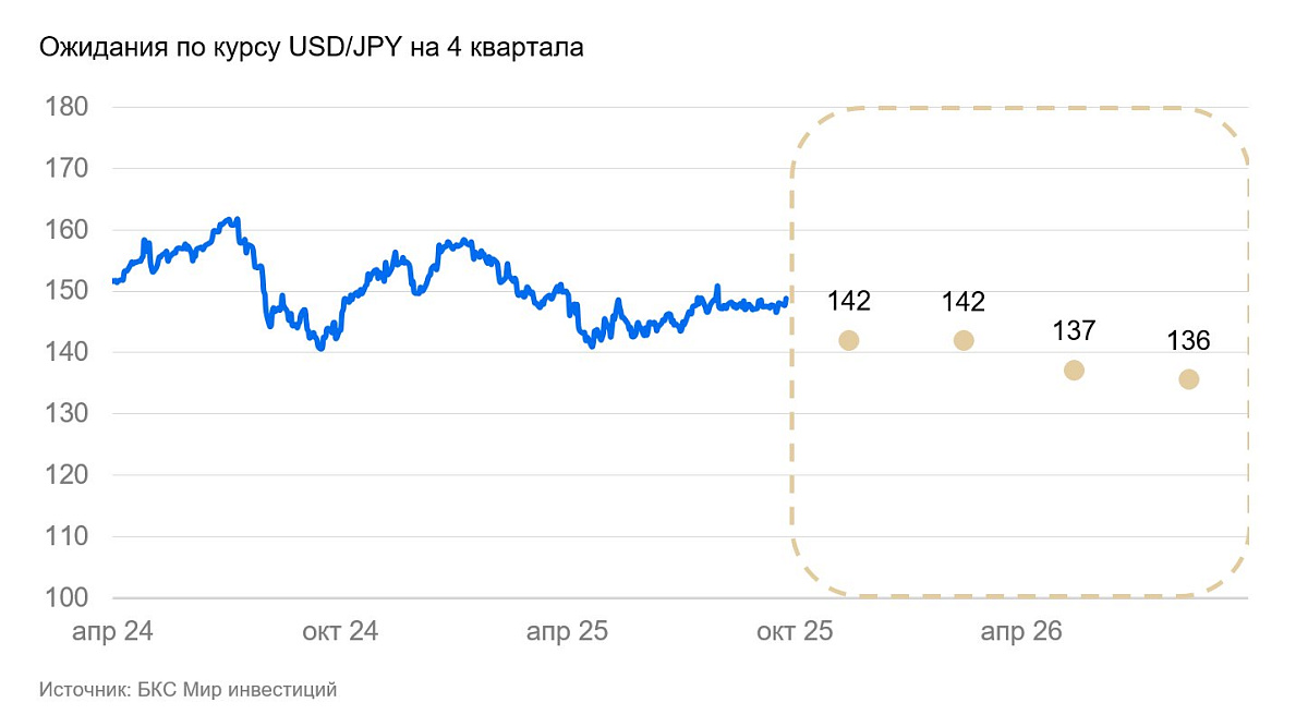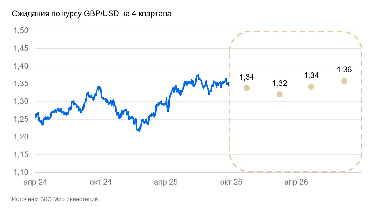 Банк Англии поддерживает ставку на уровне чуть ниже ставки ФРС и, благодаря умеренной динамике инфляции, может сохранять такую политику даже если ФРС опустит ставку до 3,5%. Мы полагаем, что до конца 2025 г. курс незначительно ослабнет, но останется исторически крепким. В 2026 г. мы ожидаем новую волну укрепления фунта — США и еврозона смягчат монетарную политику, а Лондон останется привлекательным финансовым центром для развивающихся стран.
