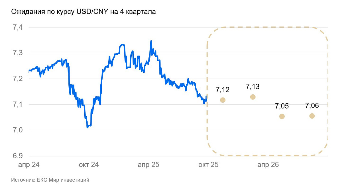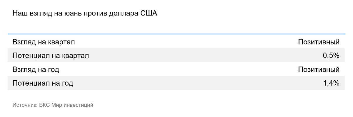 Мы ожидаем, что в 2025 г. курс укрепится до 7,1 юаня за доллар США за счет слабости последнего. В дальнейшем китайская валюта может подорожать к доллару до 7 юаней после смягчения монетарной и фискальной политики в США и еврозоне.