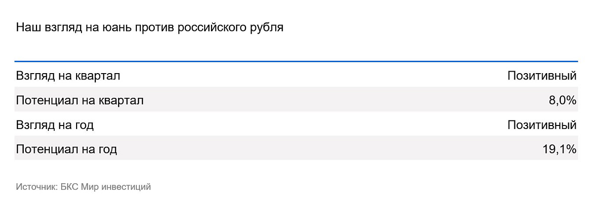 На горизонте года рубль должен подешеветь к юаню за счет слабости самого рубля и дальнейшего укрепления юаня. Мы не ожидаем существенных проблем с юаневой ликвидностью на российском рынке, как и других специфических факторов, способных повлиять на динамику валютной пары.