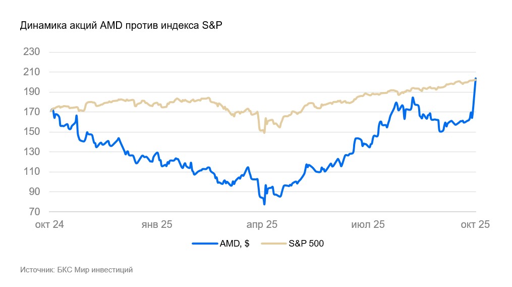 Рынок отреагировал на новость с большим энтузиазмом. В ходе основной торговой сессии в понедельник акции AMD подорожали примерно на 24%, а суммарный рост после анонса превысил 35%. Безусловно, новость крайне позитивна для компании. Партнерство с OpenAI укрепляет позиции AMD как альтернативы крупнейшей NVIDIA на рынке ИИ-инфраструктуры. Соглашение обеспечивает стабильный поток выручки до 2030 г.