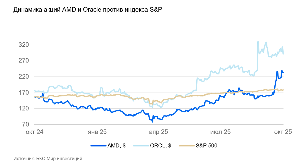 - Очевидно, инвесторы считают, что сделка положительно скажется на бизнесе AMD. В то же время акции Oracle снизились примерно на 1–1,5%. Вероятно, рынок опасается значительных капитальных затрат Oracle на развертывание новых вычислительных мощностей.