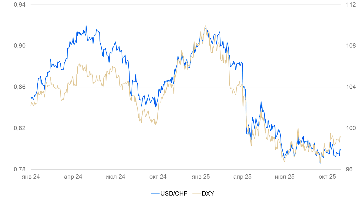 Курс франка за неделю ослаб на 0,5%, но остался на уровне 0,79 к доллару США. Значимых статистических данных по Швейцарии на неделе не выходило.