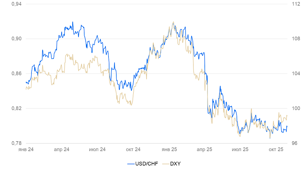 Курс франка за неделю ослаб на 0,5%, но остался на уровне 0,79 к доллару США. Значимых статистических данных по Швейцарии на неделе не выходило.