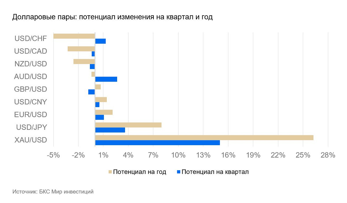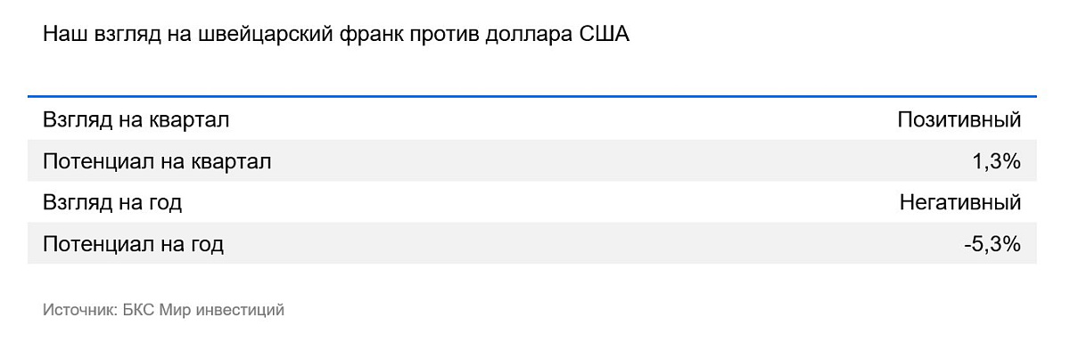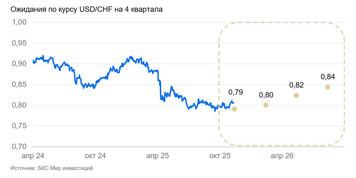 Мы полагаем, что Нацбанк Швейцарии продолжит смягчать свою политику во II полугодии 2025 г. — I полугодии 2026 г., а курс постепенно вернется в диапазон 0,85–0,9 франков за доллар США.