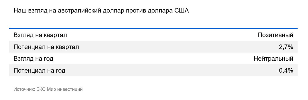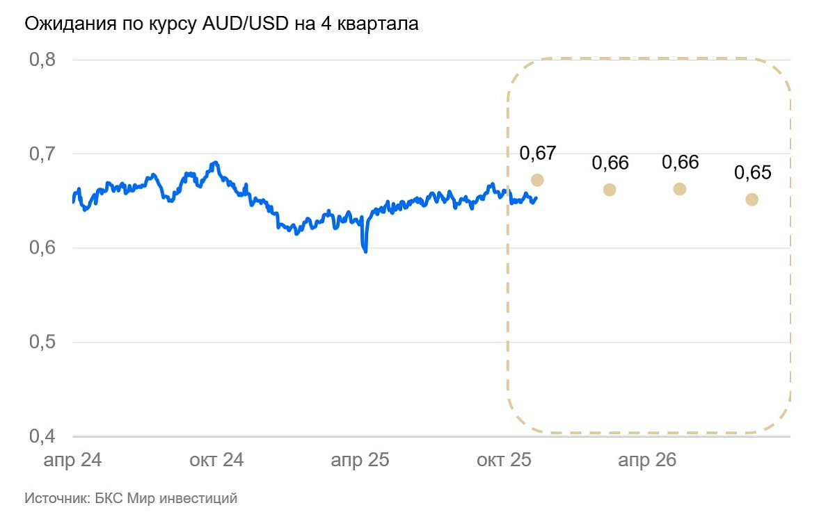В перспективе одного–двух кварталов мы ожидаем дальнейшего укрепления австралийского доллара. Однако в конечном итоге «осси» продолжит тренд на ослабление, который длится более 15 лет. Экономика Австралии открыта, две трети экспорта направляются в азиатские страны. Основа экспорта — сырье: железная руда, металлы, нефть и газ, продовольствие. Пошлины США на азиатский импорт на фоне перепроизводства во многих сырьевых отраслях должны существенно снизить спрос на сырье. Из-за этого экономика Австралии может замедлиться, и ЦБ придется понижать ставку для поддержания экономической стабильности.