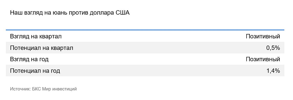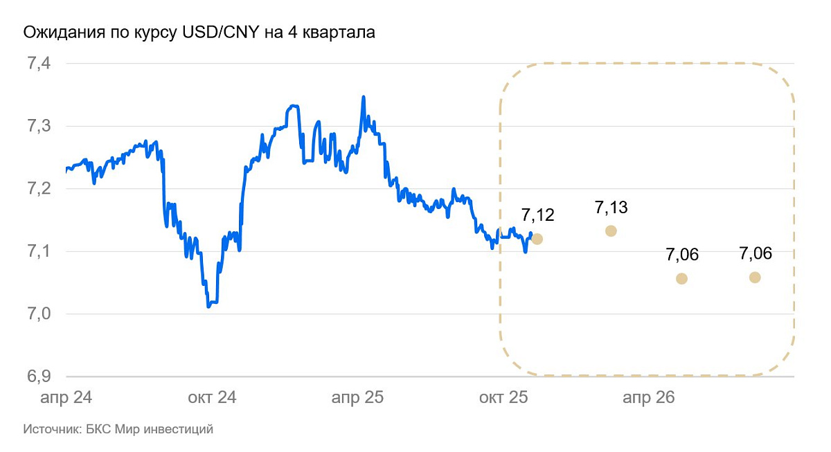 Мы ожидаем, что в 2025 г. курс укрепится до 7,1 юаня за доллар США за счет слабости последнего. В дальнейшем китайская валюта может подорожать к доллару до 7 юаней после смягчения монетарной и фискальной политики в США и еврозоне.