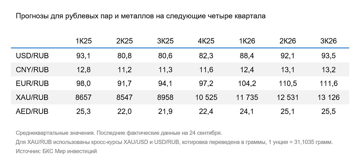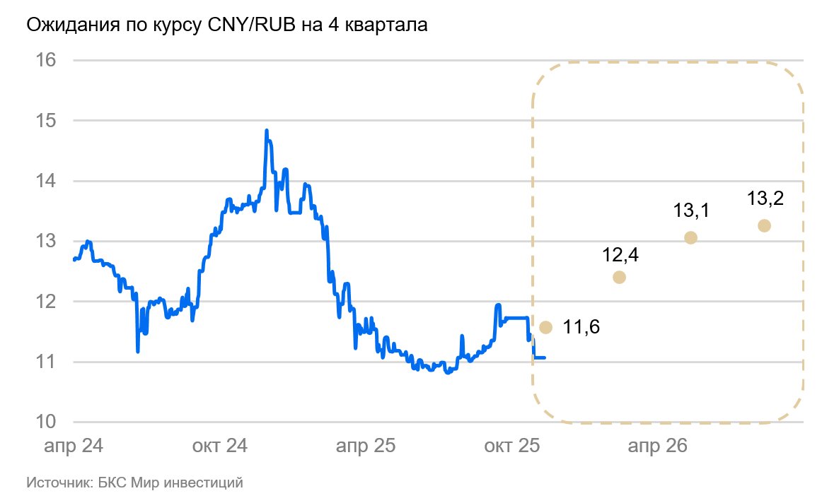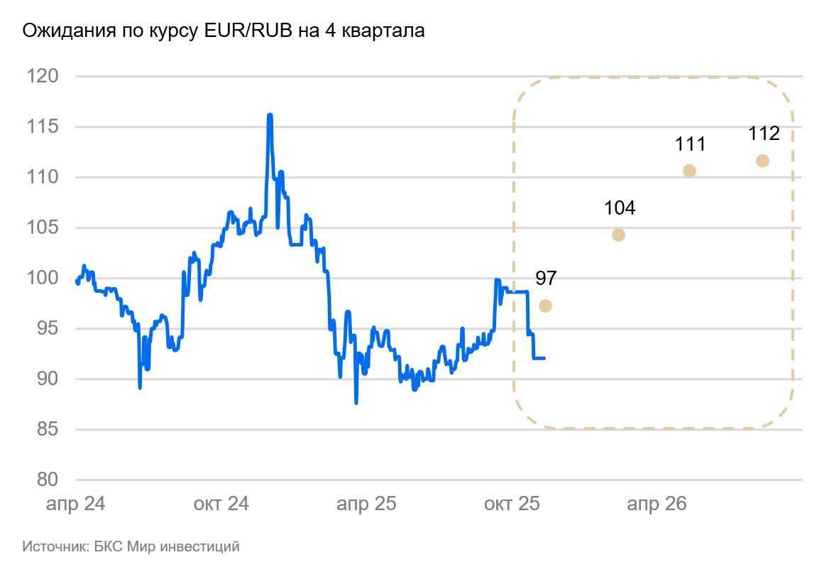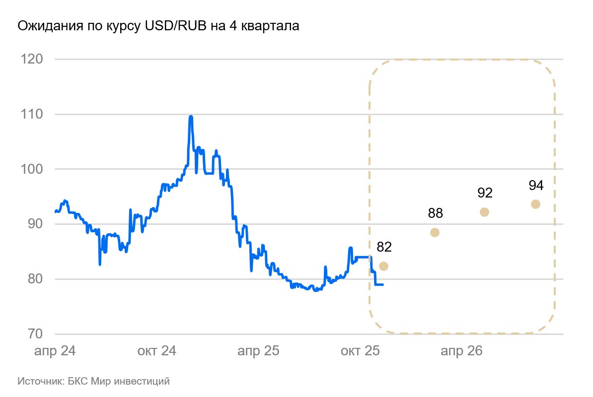 На горизонте квартала-двух низкий спрос на валюту (валютные депозиты компаний выросли, сохраняется профицит счета текущих операций) будет поддерживать рубль крепким. Мы ожидаем восстановление импорта и сокращение профицита счета текущих операций в начале 2026 г., что приведет к постепенному ослаблению рубля. Эффект от завершения продажи валюты ЦБ в рамках отложенных операций и снижение цены отсечки по бюджетному правилу ослабят курс в 2026 г. не более, чем на 3 рубля.
