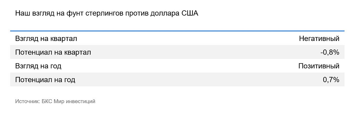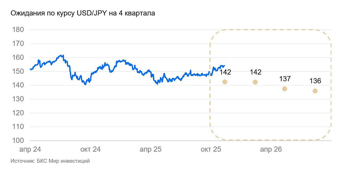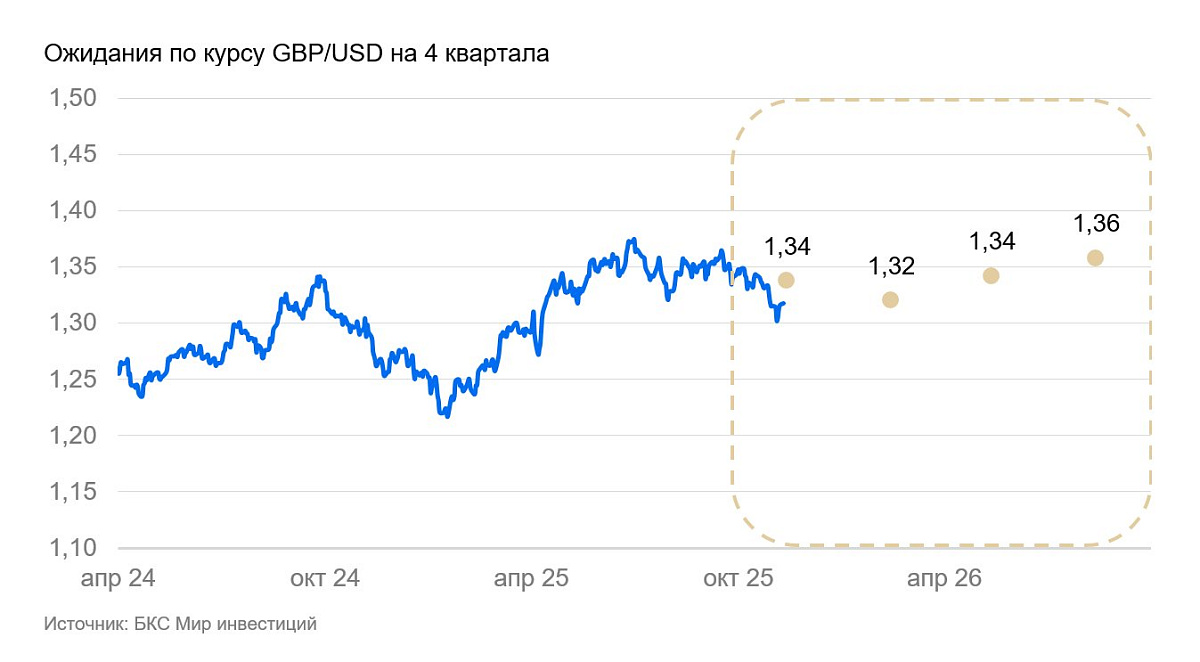 Банк Англии поддерживает ставку на уровне чуть ниже ставки ФРС и, благодаря умеренной динамике инфляции, может сохранять такую политику даже если ФРС опустит ставку до 3,5%. Мы полагаем, что до конца 2025 г. курс незначительно ослабнет, но останется исторически крепким. В 2026 г. мы ожидаем новую волну укрепления фунта — США и еврозона смягчат монетарную политику, а Лондон останется привлекательным финансовым центром для развивающихся стран.