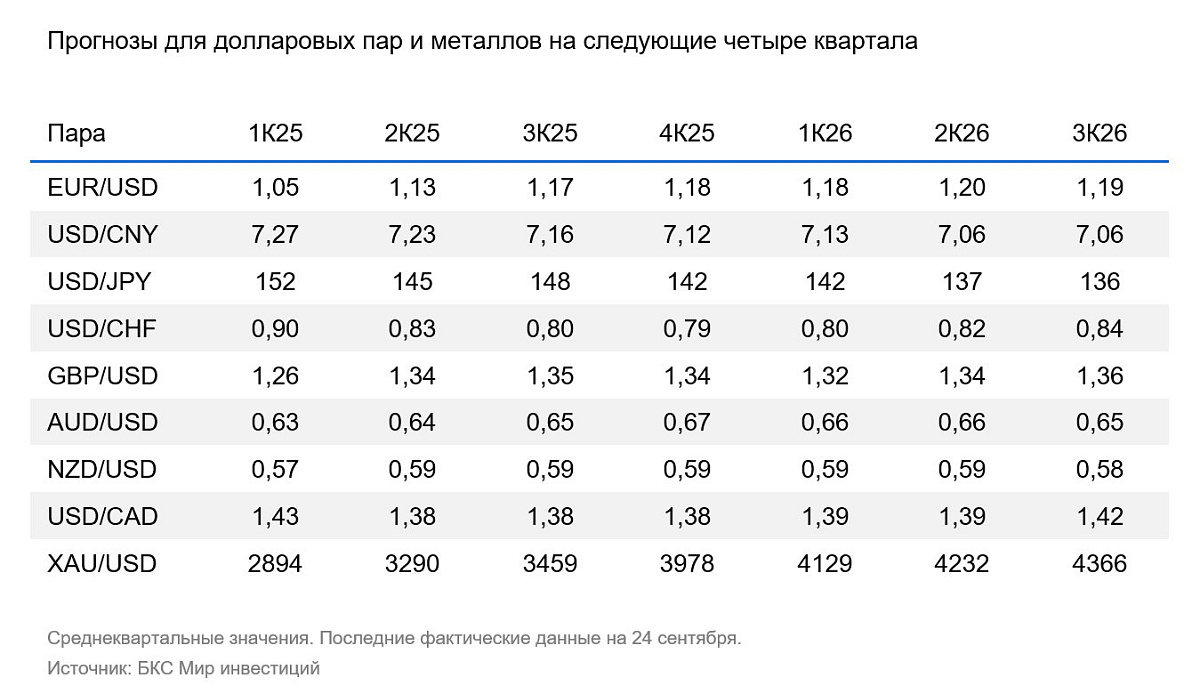 В III квартале курс доллара продолжил слабеть и достиг многолетних минимумов. Это результат оттока капитала из США для диверсификации рисков и ожиданий смягчения монетарной политики. Мы считаем, что ФРС будет смягчать ДКП до конца 2025 г. Однако влияние этого процесса на курс доллара будет куда менее выраженным, чем в первом полугодии 2025 г.: основное ослабление уже состоялось. В конце 2025 г. – I половине 2026 г. мы ждем стабилизации курса доллара к евро. Сужение спреда между ставками ФРС и ЕЦБ будет ослаблять доллар, однако экономика США фундаментально стабильнее экономики еврозоны, а геополитические и долговые риски для США существенно меньше.