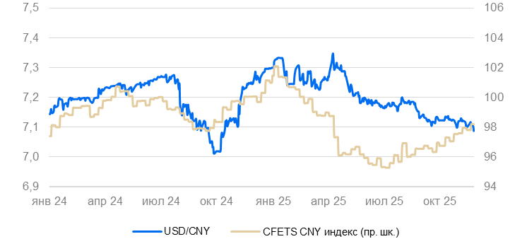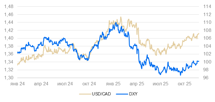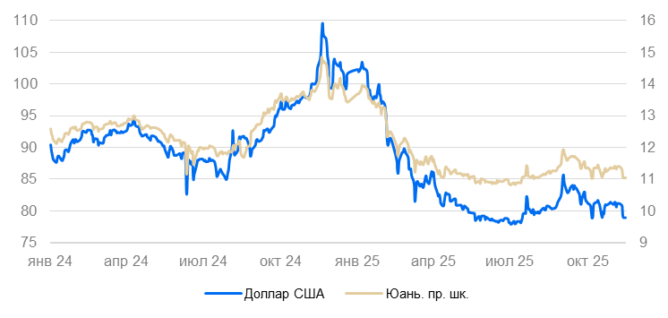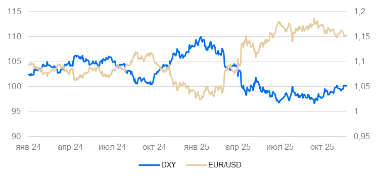 Фьючерсы на ставку ФРС, постепенно снижавшиеся с начала ноября, резко перестали закладывать снижение ставки на декабрьском заседании. Через пару дней фьючерсы вернулись на уровень 75-80% вероятности снижения ставки, однако индекс доллара значимо не снизился. Волатильности доллару добавила просадка индекса S&P 500 на фоне распродаж в ИИ-секторе, а также многочисленные слухи в СМИ о возможном разрешении украинского конфликта. Дело в том, что перспектива перемирия влияет на оценку курса евро, через нее — на доллар. По итогам прошедшей недели, с 18 по 25 ноября индекс курса доллара DXY вырос на 0,6%.