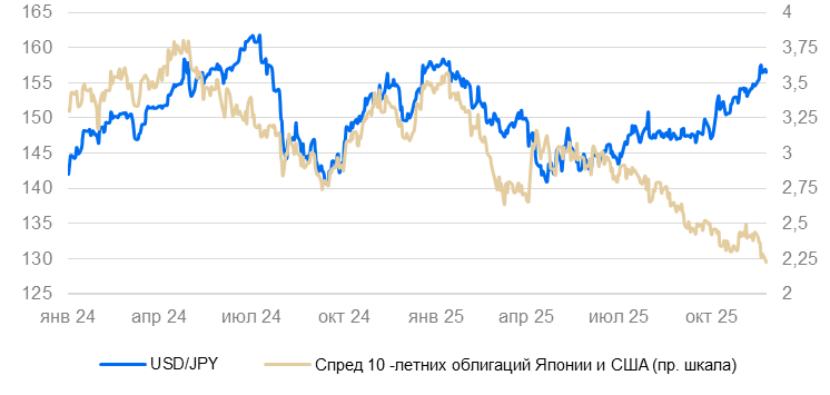 Курс иены к доллару за неделю ослаб на 0,6% — пропорционально укреплению доллара. Японская валюта слабела до 157 иен за доллар из-за локальной паники после комментариев по поводу возможной военной интервенции на Тайвань. Однако затем иена немного укрепилась.