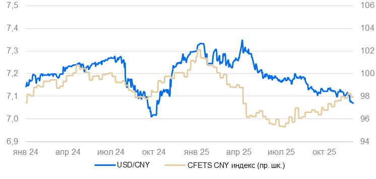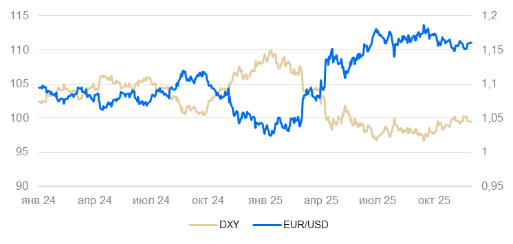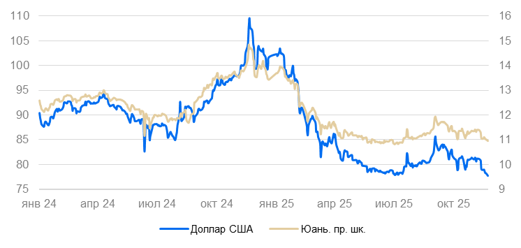 Рубль закрепился ниже 80 рублей за доллар. В конце года импорта нет — данные по торговле за III квартал 2025 г. говорят о проседании импорта на 7% г/г. Ставки остаются высокими, а валютные депозиты растут третий месяц подряд, и рост превысил $30 млрд. Все это создает ощутимую поддержку рублю, который чувствует себя комфортно и не хочет ослабляться, несмотря на снижение цен на нефть. И тут национальную валюту поддерживает бюджетное правило, которое компенсирует 7 из 10 долларов падения цены на нефть ниже цены отсечения ($60/барр).
