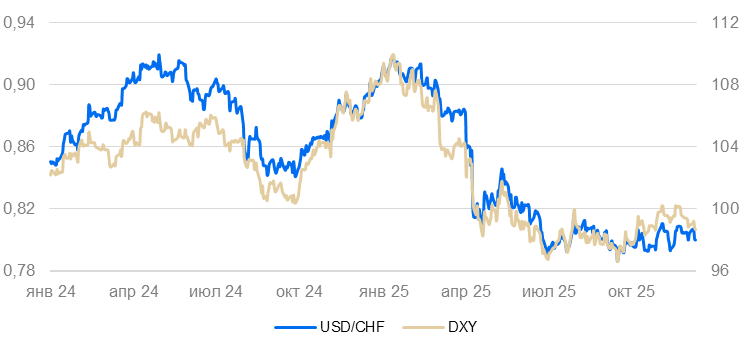 Курс франка за неделю укрепился (+0,5%) пропорционально снижению доллара.