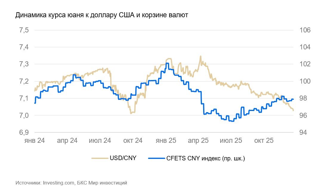 Юань вновь незначительно укрепился (+0,2%) пропорционально снижению курса доллара, до 7,03 юаней за доллар, на фоне снижения курса доллара США. Это максимальный уровень более чем за год. Частично это результат ослабления доллара, который вновь приближается к своему годовому минимуму. Однако независимое укрепление юаня (ко всем остальным валютам) также происходит.