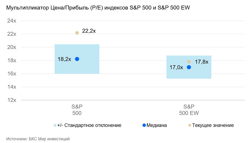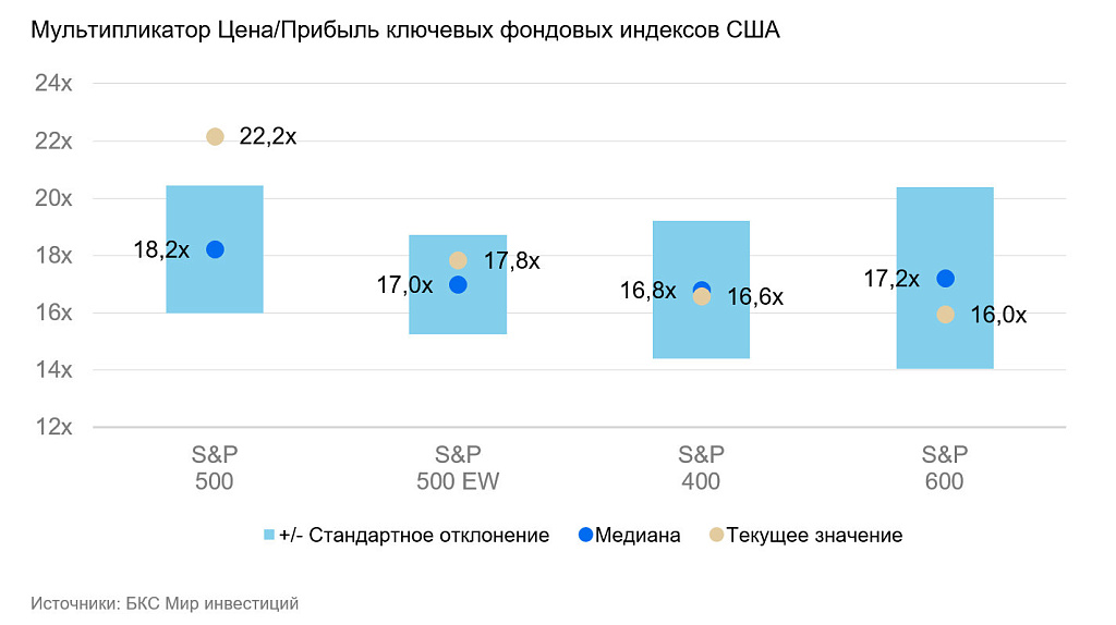 Из-за концентрации капитала в крупнейших компаниях сегмент малой и средней капитализации оказался вне фокуса большинства инвесторов и торгуется с дисконтом к своим историческим уровням. Индексы S&P MidCap 400 и S&P SmallCap 600 находятся ниже своих медианных оценок. Это формирует потенциал для переоценки по мере расширения инвестиционного участия за пределами компаний с крупнейшей капитализацией.