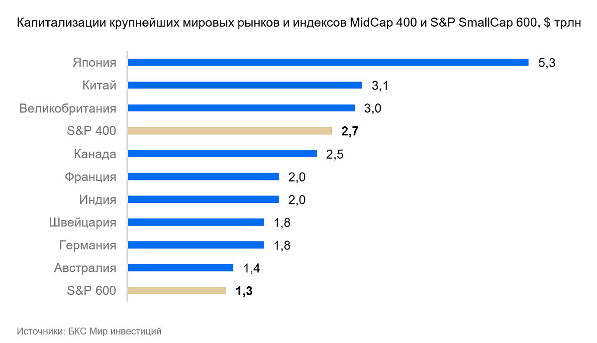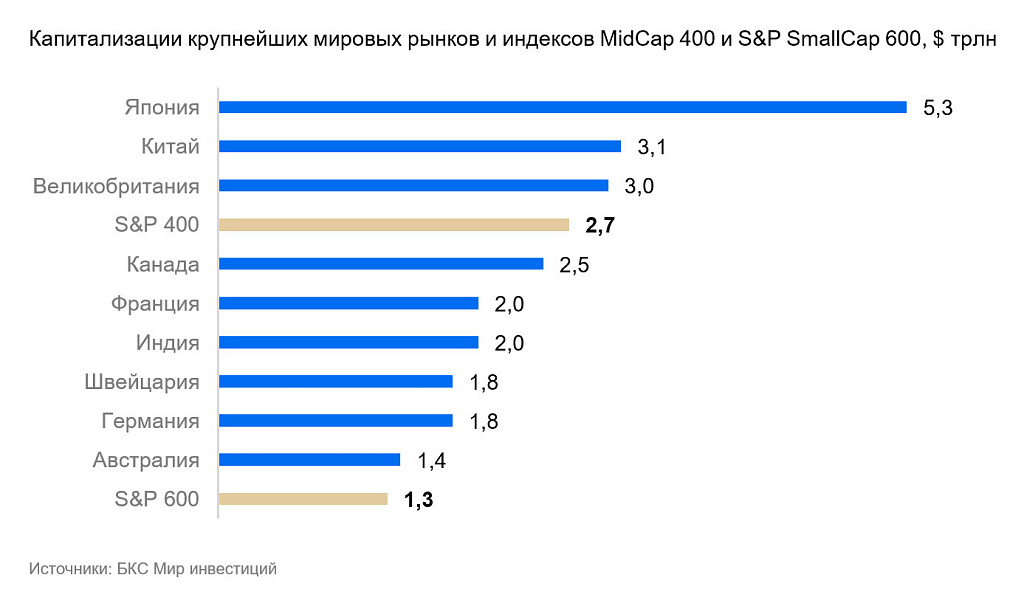 Важно подчеркнуть, что в контексте США речь не идет о маргинальном или низколиквидном сегменте. Совокупная капитализация компаний, входящих в S&P MidCap 400, составляет порядка $2,7 трлн, а в S&P SmallCap 600 — около $1,3 трлн. Если рассматривать эти сегменты как отдельные рынки, S&P MidCap 400 входил бы в пятерку крупнейших фондовых рынков мира, а S&P SmallCap 600 — в десятку. Это институционально значимый класс активов, способный играть самостоятельную стратегическую роль.
