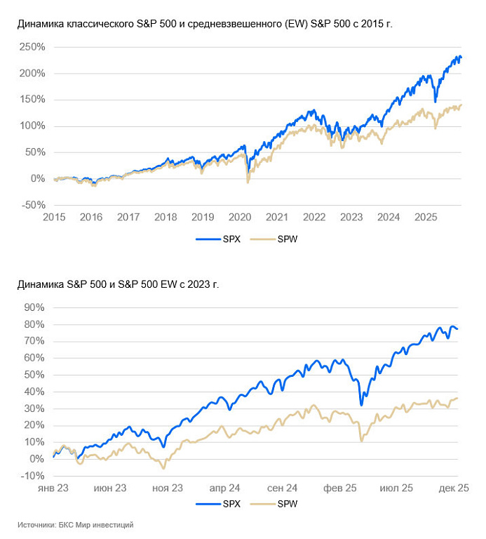 Высокая концентрация капитала напрямую отражается в расхождении между классическим индексом S&P 500 и его равновзвешенным аналогом. Исторически эти индексы демонстрировали высокую степень корреляции, однако начиная с 2023 г. разрыв между ними начал устойчиво расширяться, отражая перераспределение капитала в пользу узкого круга крупнейших компаний.