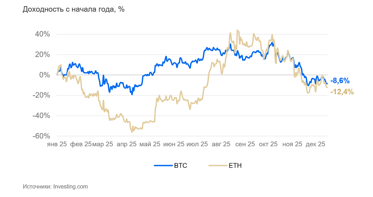 Несмотря на достигнутые пиковые значения в летне-осенний период, текущая доходность активов с начала года находится в отрицательной зоне. После резкого обвала 10 октября, вызванного масштабными ликвидациями на рынке деривативов, рынок вошел в фазу капитуляции: биткойн пробил глобальный уровень поддержки в $100 тыс. и скорректировался к $80 тыс.