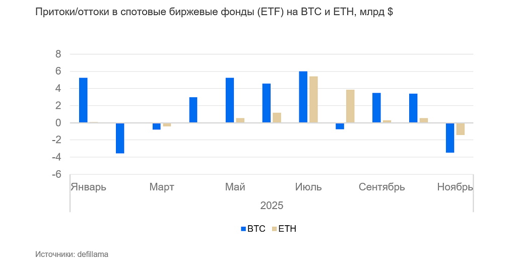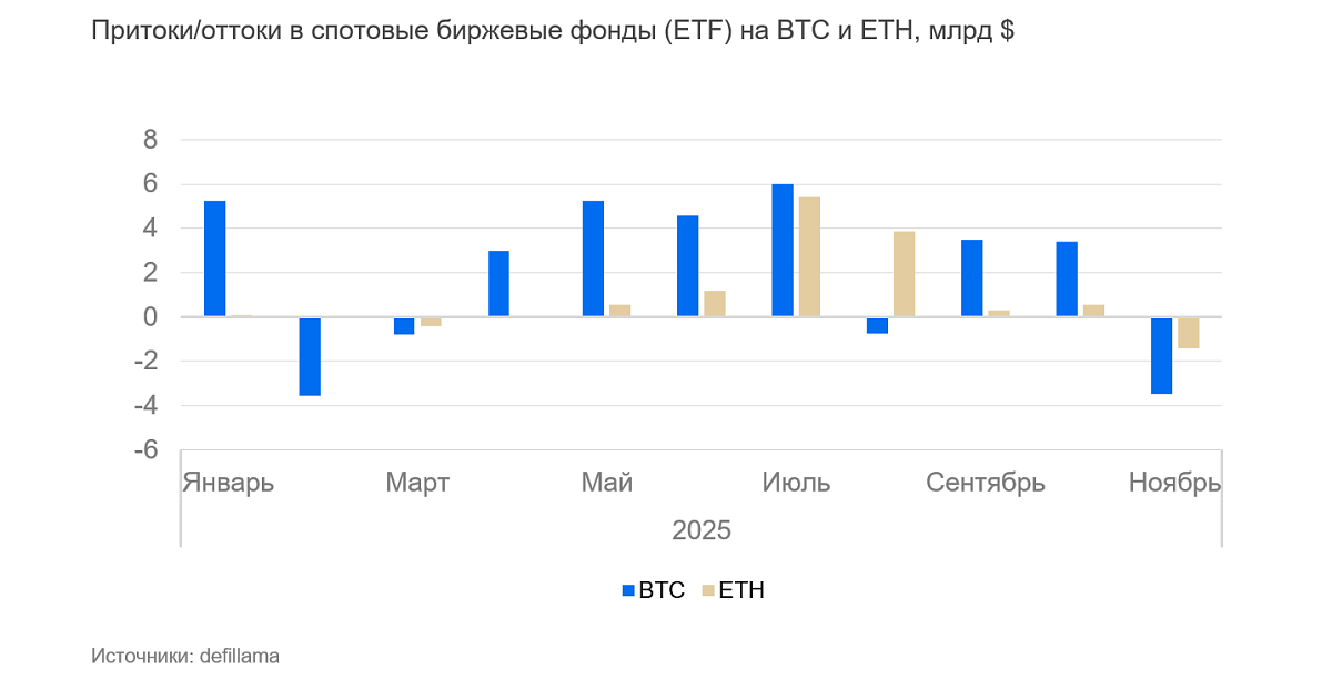 Поворотной точкой для рыночных настроений стало 10 октября, когда масштабная волна ликвидаций на рынке деривативов спровоцировала стремительный обвал в криптовалютах. Притоки в криптовалютные биржевые фонды (ETF) сменились устойчивыми оттоками, а биткойн пробил долгосрочный уровень поддержки в $100 тыс. и скорректировался в район $80 тыс.