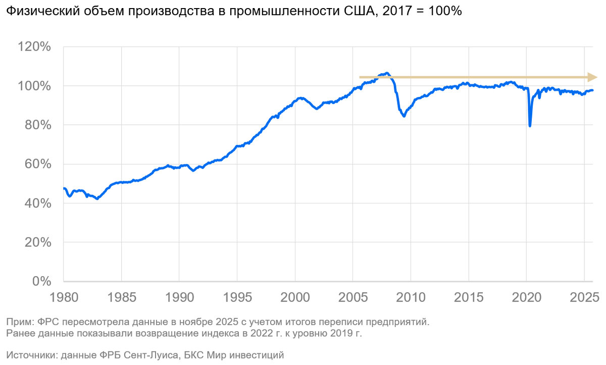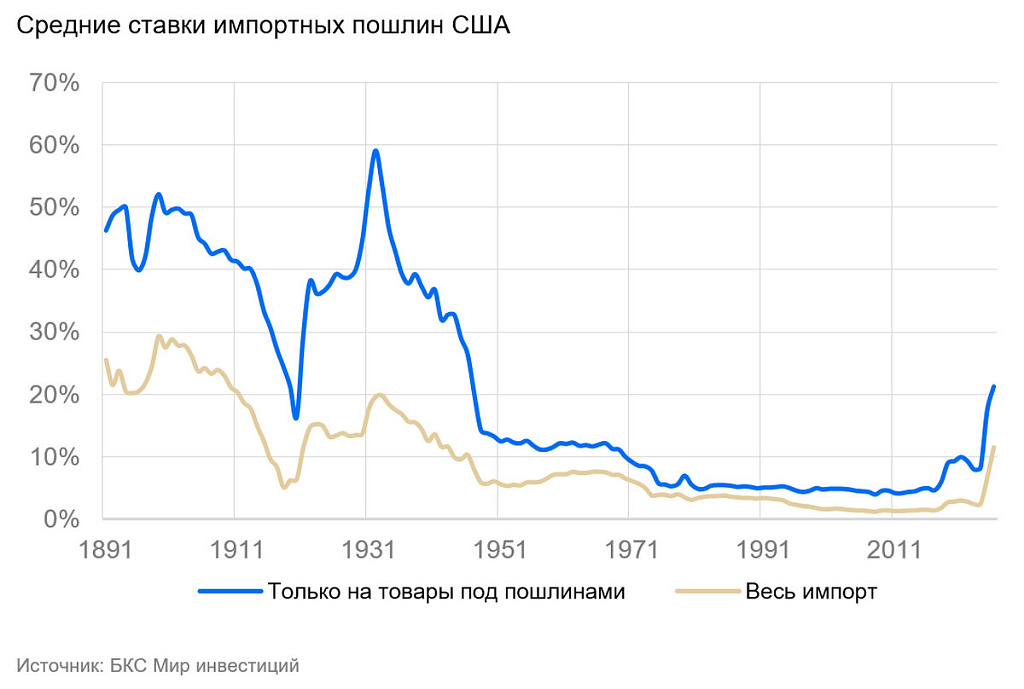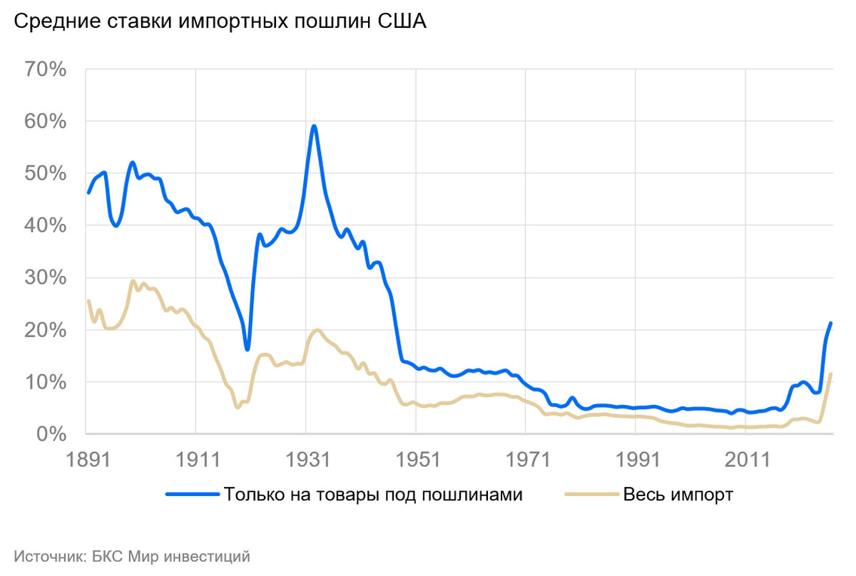 По состоянию на конец 2025 г., период повышения пошлин в целом, видимо, завершен. Последний раунд переговоров с Китаем в октябре 2025 г. оказался неуспешен для США — стороны вернулись к условиям ведения торговли, которые действовали в середине 2025 г. Новый средний уровень пошлин — 20–22% (эффективная ставка 12–15%, с учетом разовых освобождений от пошлин и перенаправления закупок в третьи страны). Большую часть своей истории США развивались со сравнимым или большим уровнем пошлин. После адаптации крупнейших компаний к новым условиям пошлины не должны быть существенным препятствием для роста экономики.