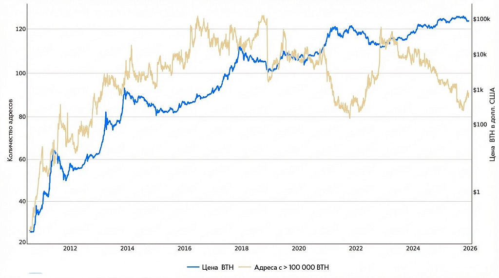 Одновременно рынок перешел из фазы эйфории в фазу капитуляции: индекс страха и жадности опускался до экстремально низких значений, отражая рост апатии и резкое сокращение активности. Показательно, что число крупных держателей биткойна (с балансами более 10 тыс. монет) снизилось до минимальных уровней с 2021 г. — периода, когда биткоин в предыдущем цикле находился вблизи своих исторических максимумов.