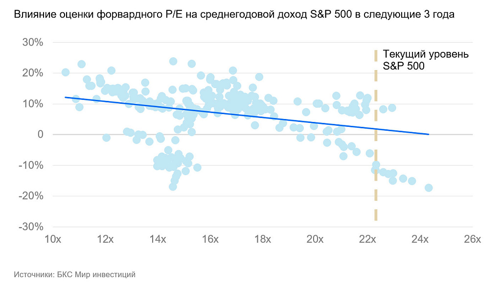 Исторический анализ взаимосвязи форвардного P/E и последующей динамики индекса показывает, что при стартовых значениях мультипликатора, сопоставимых с текущими, распределение будущих доходностей, как правило, смещается в сторону более сдержанных сценариев на уровне индекса в целом.