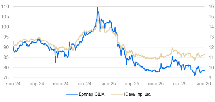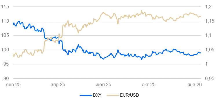 Год начался с череды громких политических инцидентов. США захватили президента Венесуэлы, в Иране вспыхнули массовые беспорядки, США и Европа обменялись агрессивными заявлениями из-за Гренландии. Но несмотря на это валютные рынки оставались достаточно стабильными — индекс доллара DXY колебался на уровне 98 пунктов. При этом вместе с аппетитом к риску сохранялся и высокий спрос на драгоценные и промышленные металлы. Цены на золото и серебро вновь бьют рекорды, а цены на медь и алюминий к ним приближаются. S&P 500 и ряд других фондовых индексов также переписали исторические максимумы. Рубль начал неделю небольшим ослаблением c 78 до 78,8 за доллар.