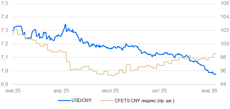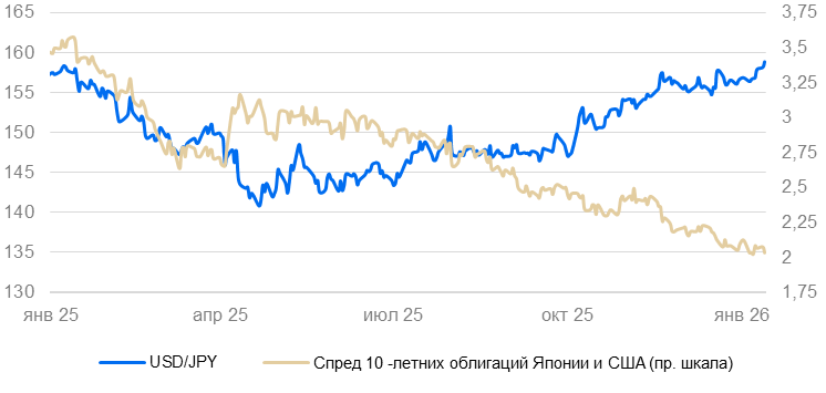 Иена за неделю ослабла почти на 1,5% до 158. СМИ сообщили, что премьер-министр Японии Санаэ Такаити собирается распустить нижнюю палату парламента, чтобы на последующих выборах увеличить долю депутатов своей партии, которая сейчас пользуется высоким доверием у избирателей. В таком случае правительство Такаити будет проще увеличить расходы бюджета, что предполагает большее ослабление иены.
