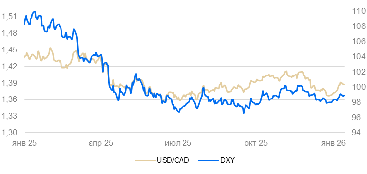 Уровень безработицы в декабре вырос с 6,5% до 6,8% и остался у трендового уровня 2025 г. Индекс PMI в декабре вырос с 45 до 47 пунктов за счет улучшения настроений в секторе услуг. Однако и в промышленности, и в услугах тренд по-прежнему указывает на ожидаемое снижение деловой активности. Без новых политических шоков «луни», вероятно, продолжит следовать за долларом США.