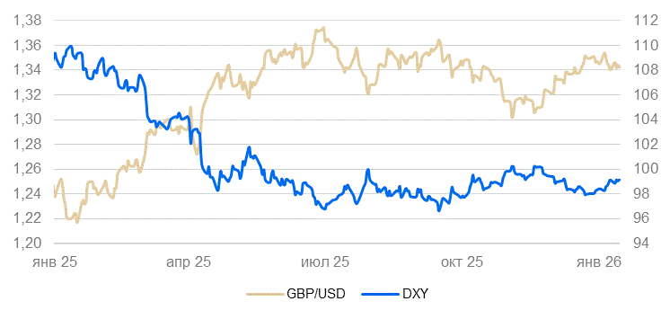 На неделе евро ослаб на 0,4%. За первые две недели года курс евро снизился к доллару на 0,9%, но в целом остается в коридоре, сформированном еще в середине 2025 г.
