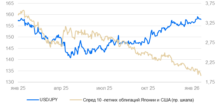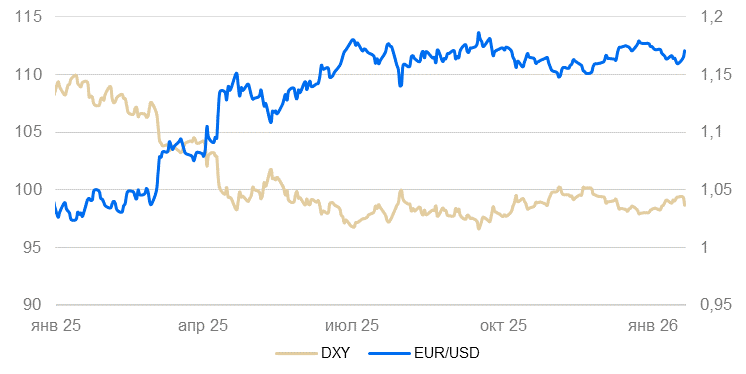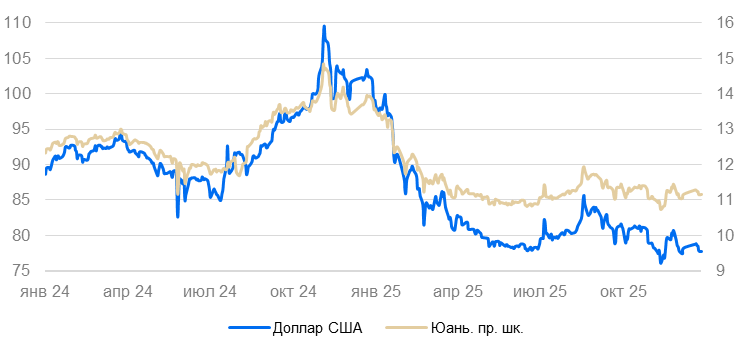 Полагаем, что смягчение денежно-кредитной политики ФРС, ожидающееся в I полугодии 2026 г. будет способствовать сохранению слабого курса доллара.