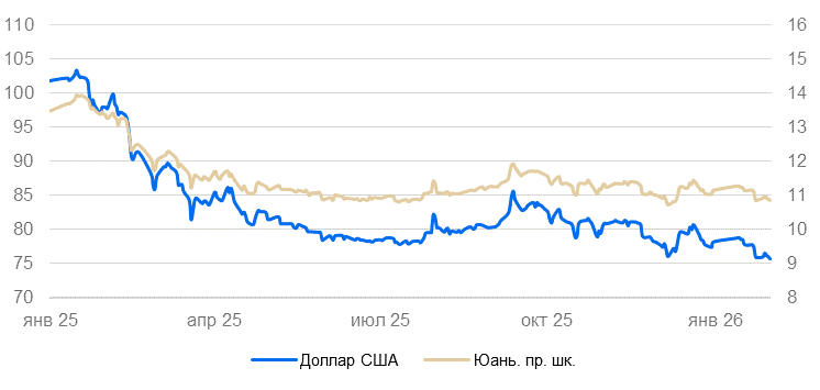 Полагаем, в ближайшем будущем 2026 г. индекс доллара к корзине основных валют DXY будет оставаться в диапазоне 95–98 п.