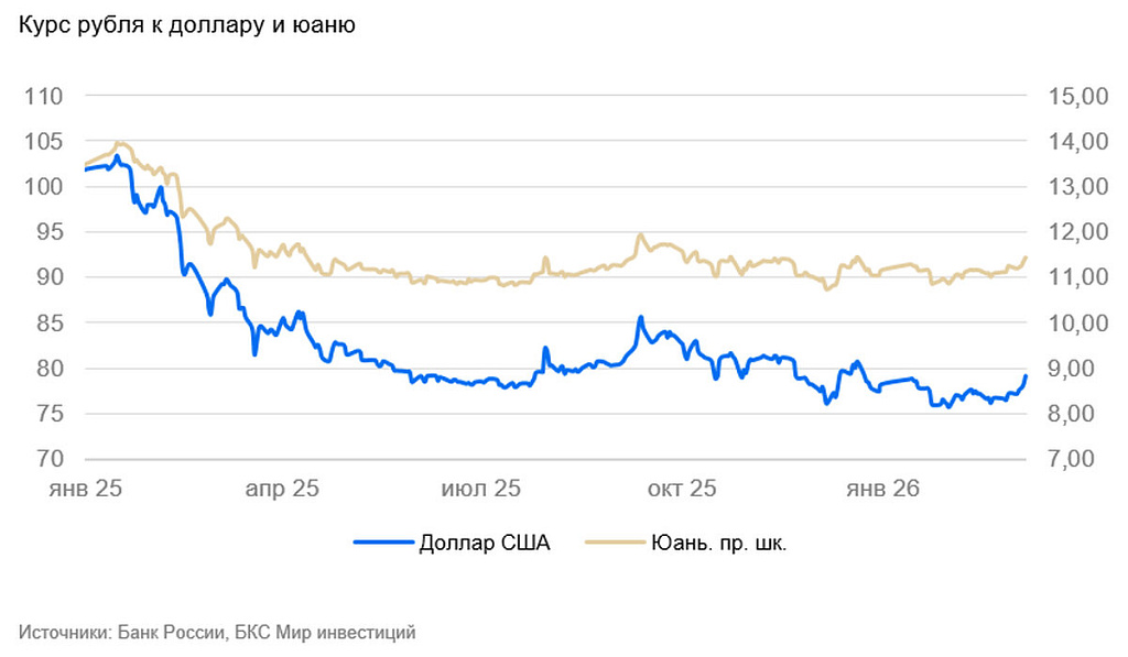 Рубль продолжает продвигаться к верхней границе нашего прогнозного диапазона 76–80 рублей за доллар США. Курс начал неделю вблизи 79 рублей. Рынок ждет новых параметров цены отсечения (сейчас 59 рублей за доллар). Мы прогнозируем снижение до 50 рублей (наш базовый сценарий) и смещение курса в диапазон 80-83 рублей за доллар. Минфину есть резон потянуть с публикацией, так как в ближайшие 7-10 дней станет понятно, в какую сторону будет развиваться иранский кризис и как будет формироваться предложение нефти и, следовательно, ее цена.