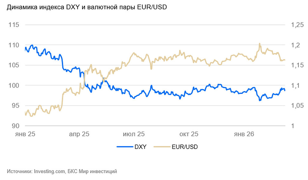 Индекс курса доллара США DXY за неделю снизился на 0,4% до 98,7 пунктов. Бегство в качество продолжилось, что привело к частичным распродажам рисковых активов. В частности, индекс S&P 500 опустился ниже уровня начала года.